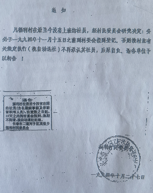 村民提供的另一份《通告》显示:“福利村在册至今没有在岗的社员(含长期病事假及停薪留职等人员),自登报之日起,15天之内到村委会报道,逾期不到者,按自动退社处理”。落款是“长春市二道河子区英俊乡福利村民委员会”。