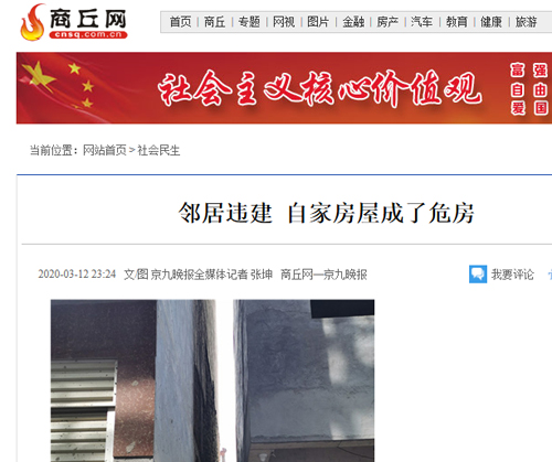 3月11日,柘城县读者周女士向记者反映,由于邻居违建,导致自家500多平方米的房子成了C级危房,家人不敢居住。虽然向多个部门反映此事,但事情至今没有解决。