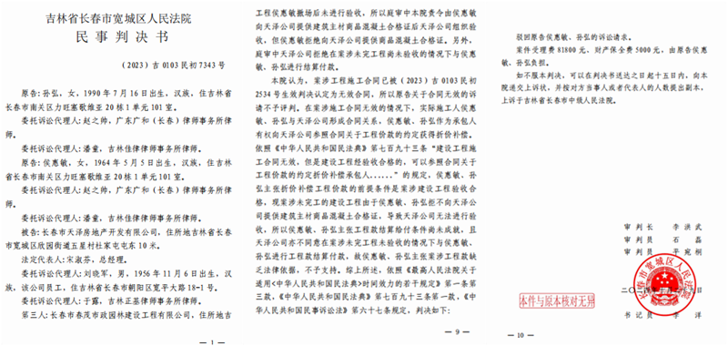 本站讯 从办公楼图纸签订的固定总价合同,到实际按公寓楼图纸施工却拿不到工程款;从一审法院拒绝对工程量进行司法鉴定,到以“未提供混凝土合格证”为由驳回诉求,再到另一关联案件被指采信单方结算报告造成千万损失——吉林省长春市实际施工人侯惠敏与长春市天泽房地产开发公司(下称“天泽公司”)的工程款纠纷,历经一审程序后陷入“维权困境”。如今,多家媒体曝光后,随着长春市中级法院以“事实不清”为由将其中一案(7343号)发回重审,侯惠敏终于看到了维权的曙光,她感谢法官的公正履职与检察机关的监督支持,期待重审能还自己一个公道。