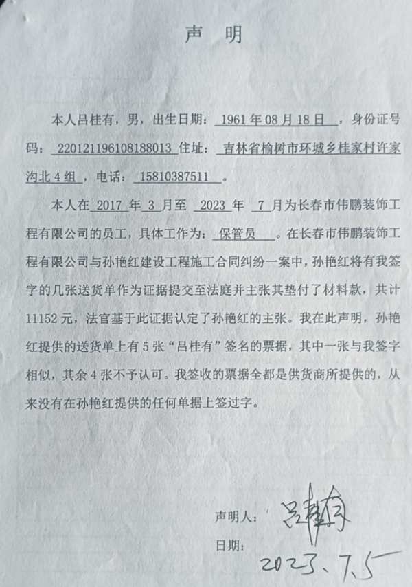 孙艳红主张其垫付了材料款1.1万余元,并提交了有伟鹏公司员工“吕桂有”签名的送货单作为证据。然而,保管员吕桂有在2023年7月5日出具亲笔声明,郑重指出:“孙艳红提供的送货单上有5张‘吕桂有’签名的票据,其中一张与我签字相似,其余4张不予认可。我签收的票据全部是供货商所提供的,从来没有在孙艳红提供的任何单据上签过字。”伟鹏公司从来未让孙艳红购买过材料。