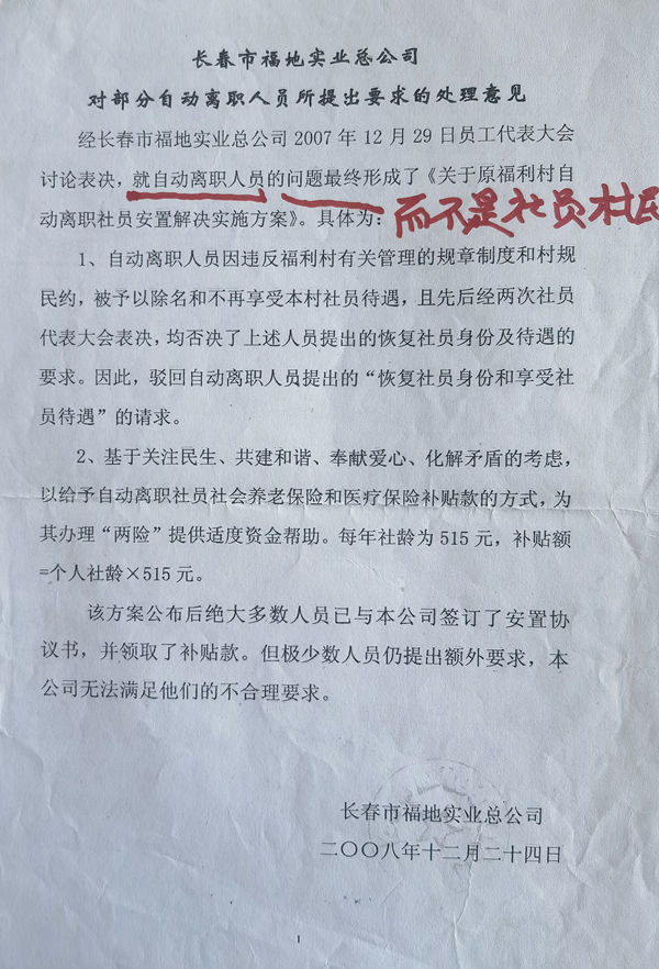 从2008年12月24日长春市福地实业总公司(以下简称:福地公司)作出的《对部分自动离职人员所提出要求的处理意见》也能看到,“自动离职人员因违反福利村有关管理的规章制度和村规民约,被予以除名和不再享受本村社员待遇,且先后经两次社员代表大会表决,均否决了上述人员提出的恢复社员身份及待遇的要求。因此,驳回自动离职人员提出的‘恢复社员身份和享受社员待遇’的请求”。
