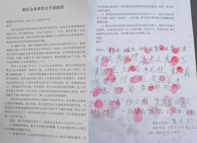 秸秆处理劳务费拖欠六年不给,德惠26个农户向社会各界的公开求助
