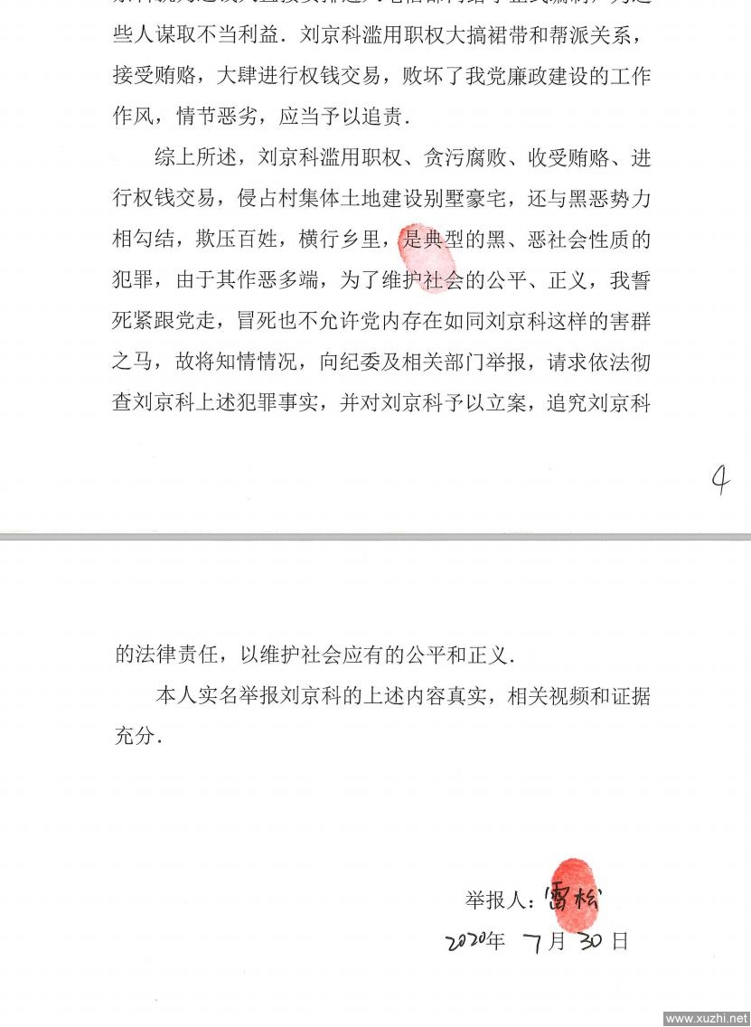 综上所述,刘京科滥用职权、贪污腐败、收受贿赂、进行权钱交易,侵占村集体土地建设别墅豪宅,还与黑恶势力相勾结,欺压百姓,横行乡里,是典型的黑、恶社会性质的犯罪,由于其作恶多端,为了维护社会的公平、正义,我誓死紧跟党走,冒死也不允许党内存在如同刘京科这样的害群之马,故将知情情况,向纪委及相关部门举报,请求依法彻查刘京科上述犯罪事实,并对刘京科予以立案,追究刘京科的法律责任,以维护社会应有的公平和正义.