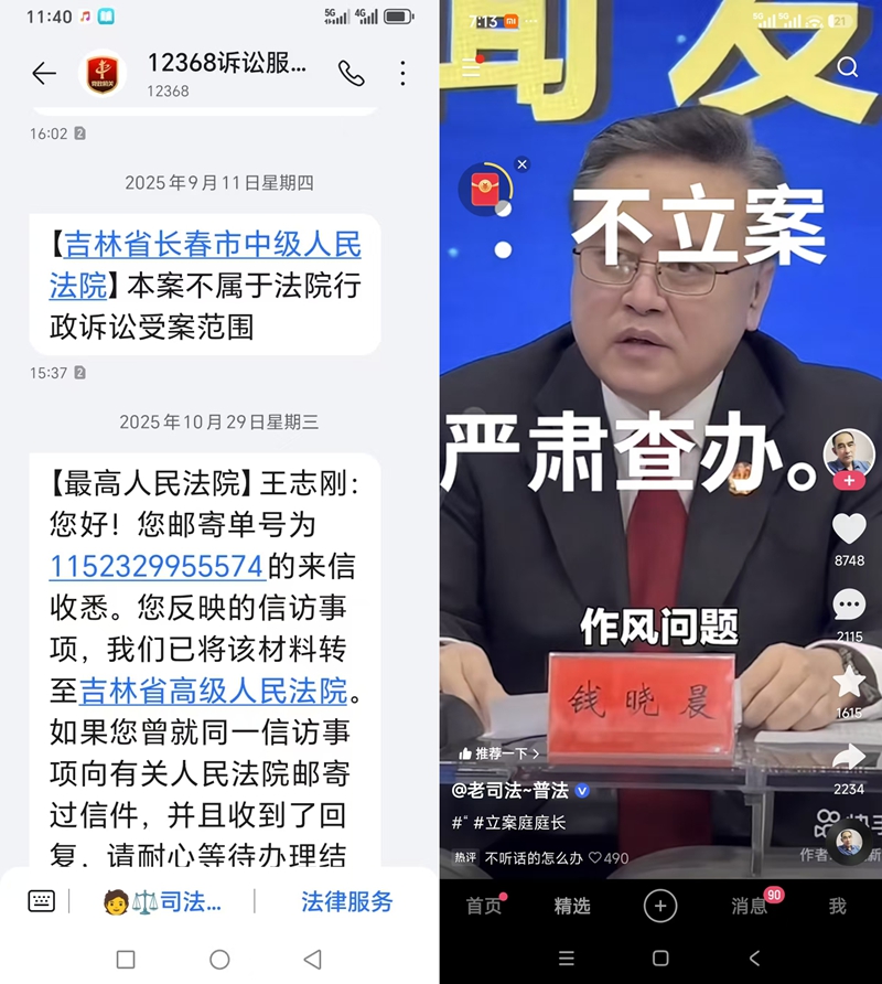 在多方维权无果后,王志刚依据《中华人民共和国行政诉讼法》相关规定,向法院提起行政诉讼。其诉讼请求明确,要求依法判令长春市政府履行法定职责,责成德惠市政府履行支付被征收土地使用权补偿款的法定义务。但是,在等待了几个月之后,王志刚等来的并不是好消息。2025年9月11日,长春中院居然用短信回复他:“本案不属于法院行政诉讼受案范围”!连个书面答复都没有给他。这,令他十分费解和气愤。