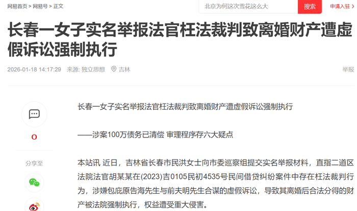 长春一女子实名举报法官枉法裁判致离婚财产遭虚假诉讼强制执行