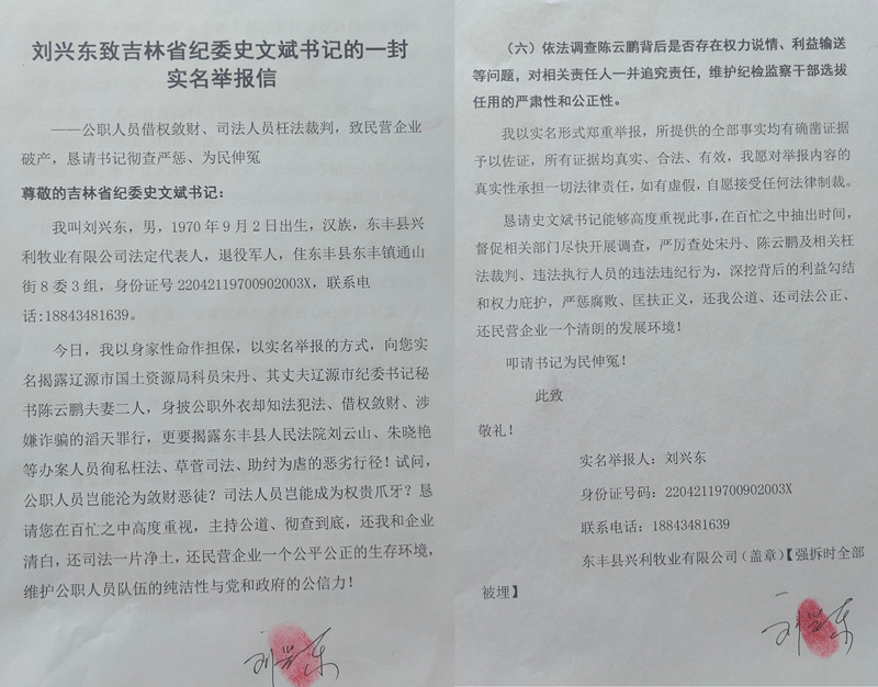 今日,我以身家性命作担保,以实名举报的方式,向您实名揭露辽源市国土资源局科员宋丹、其丈夫辽源市纪委书记秘书陈云鹏夫妻二人,身披公职外衣却知法犯法、借权敛财、涉嫌诈骗的滔天罪行,更要揭露东丰县法院刘云山、朱晓艳等办案人员徇私枉法、践踏司法、助纣为虐的恶劣行径!试问,公职人员岂能沦为敛财恶徒?司法人员岂能成为权贵爪牙?恳请您在百忙之中高度重视,主持公道、彻查到底,还我和企业清白,还司法一片净土,还民营企业一个公平公正的生存环境,维护公职人员队伍的纯洁性与党和政府的公信力!